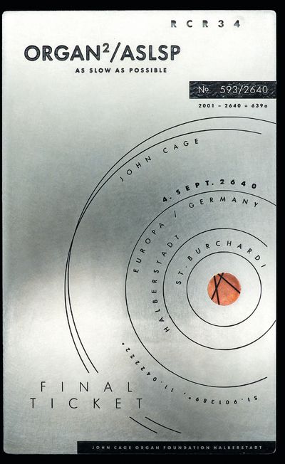 But seriously, the new funding concept allows friends and supporters to participate directly and by name in the John Cage Organ Art Project Halberstadt by purchasing a kind of art share, the “Final Ticket.” This participation is, of course, valid for generations. The tickets entitle the current owner to attend the closing event of the John Cage Organ Art Project Halberstadt. The program has not yet been finalized.