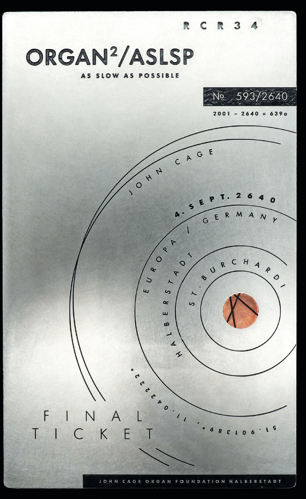 Nun mal im Ernst. Das neue Förderkonzept sieht vor, dass Freunde und Unterstützer sich durch den Erwerb einer Art Kunstaktie, des "Final Tickets", am John-Cage-Orgel-Kunst-Projekt Halberstadt direkt und namentlich beteiligen können. Diese Beteiligung gilt natürlich über Generationen. Die Tickets verbriefen dem derzeitigen Eigentümer das Recht, an der Abschlußveranstaltung des John-Cage-Orgel-Kunst-Projekt Halberstadt teilnehmen zu dürfen. Das Programm steht noch nicht fest. Diese Kunstaktie wird in der Form einer künstlerisch gestalteten Platte, aus der Kombination von zwei korrosionsfesten Metallen, entstehen. Grafische Elemente und andere Hinweise werden durch Laser- oder Frästechnik eingearbeitet. So sind Sicherheits- und Prüfelemente gewährleistet, die auch in der weiteren Zukunft fälschungssicher sind und immer einfach geprüft werden können. Die Platte kann als Kunstwerk an den Wänden von eigenen Räumen ausgestellt werden, sie kann aber auch gesichert verwahrt werden. Sie persönlich werden durch Ihr Engagement zu einem festen Teil des Projektes.
